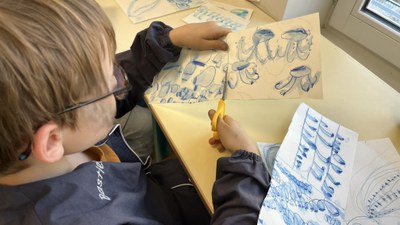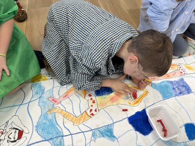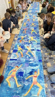 Réalisations d'une fresque sur le thème de la natation. Les pantins se transforment en nageurs sur une longue fresque commune : sur le ventre, sur le dos, en mode nage, jeux, plongée…
