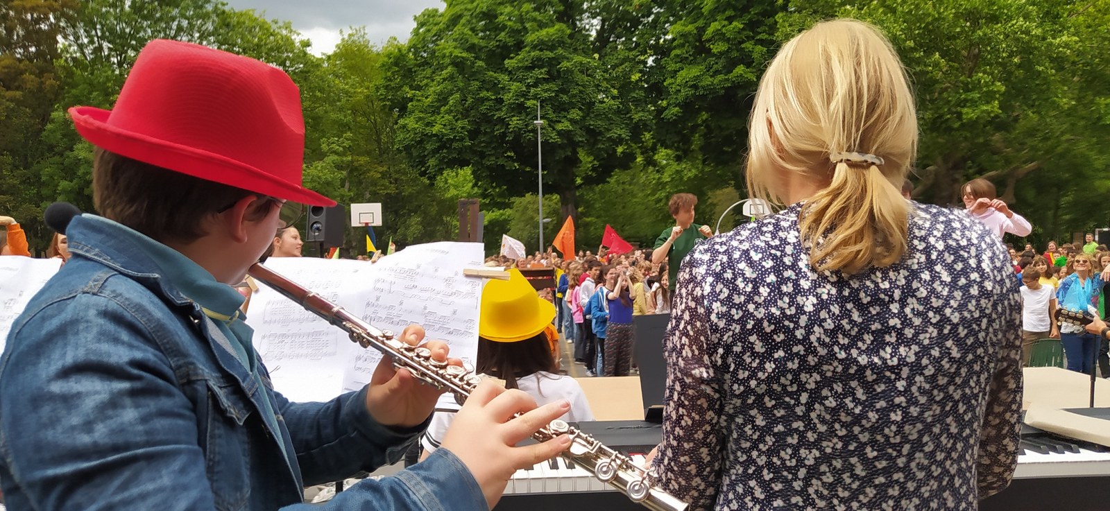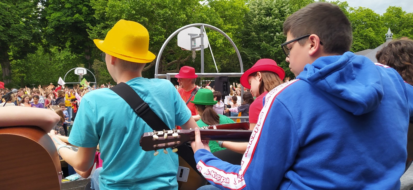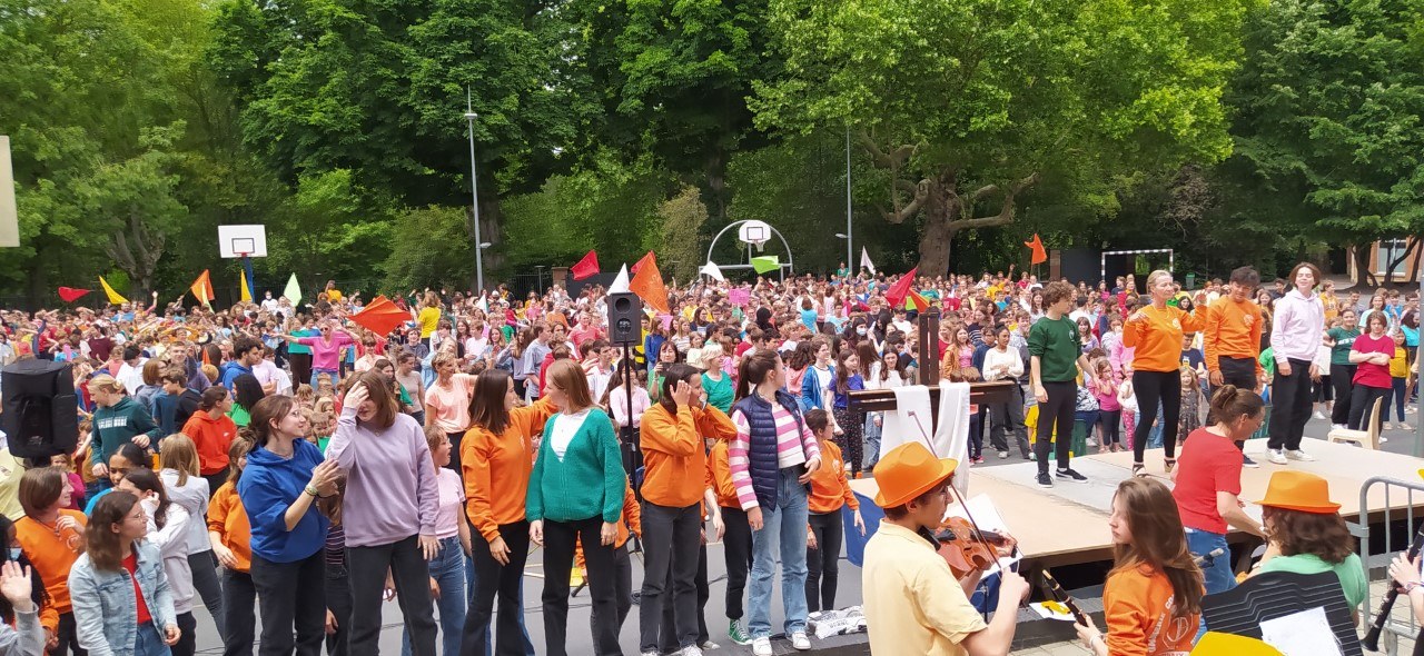 Tous les élèves de l'établissement Jeanne d'Arc fêtent la Pentecôte. Chants, mime de l'évangile, messages en toutes les langues, chorégraphie à 1400 personnes !