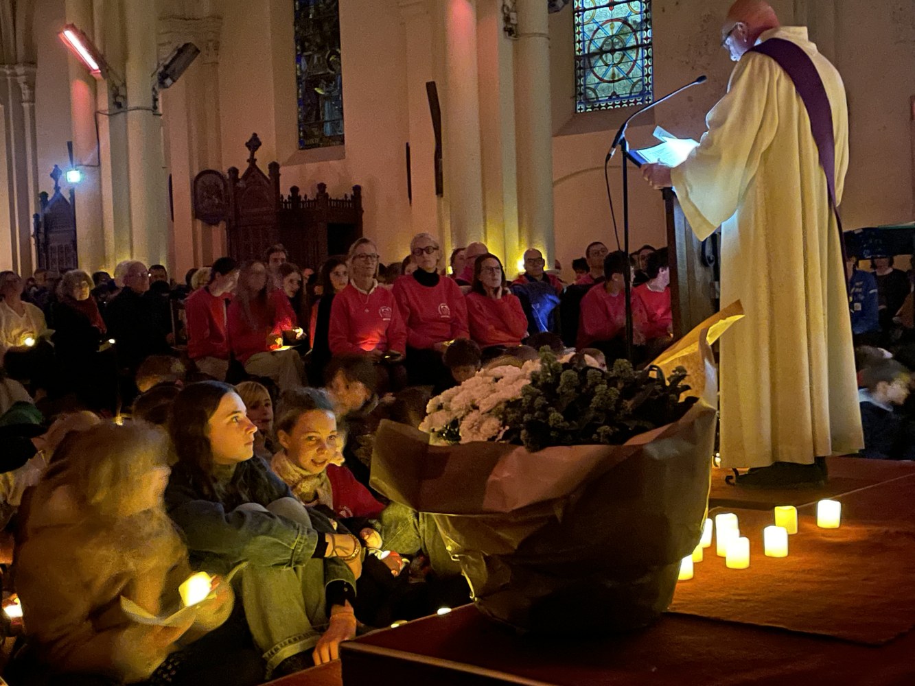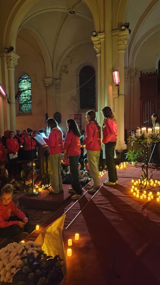 Organisée et animée par les élèves de l'aumônerie, une messe à la lueur de centaines de bougies et à la lumière de Bethléem apportée par les scouts. Un beau moment de prière fraternelle.